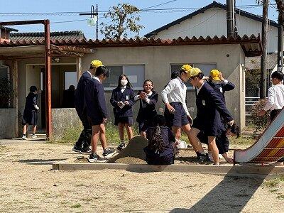 小学生らしく仲良く砂遊びを満喫する6年生 |