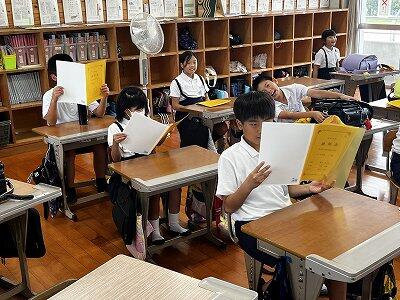 週末の金曜日は前期の通知表を子どもたちに渡しました。各クラスの通知表渡しの様子を撮らないといけないと思っていたのに、うまく時間が合わなくて、撮れたのは4年生だけでした。ということで写真は代表で4年生です。