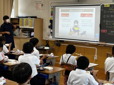 2学期の学校もいろいろ動き出して掲示が変わってきたり、新しい取り組みが始まったりしています。写真はその中のひとつ(2つ)です。図書室前の掲示は、たくさん本を読んでいる人たちの紹介かな~、給食を食べながら見ているのは町内の学校で共通して見ることになっている保健関係のビデオです。またくわしい様子は、本HPでもどこかでくわしく紹介もあるかもしれませんね。
