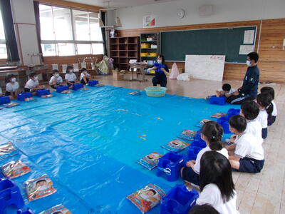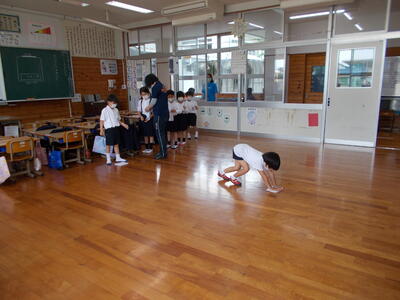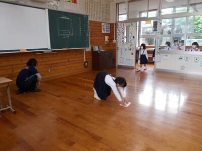 給食時間前でしたが、1年生のみんなは 集中して 床をふき上げることができました。