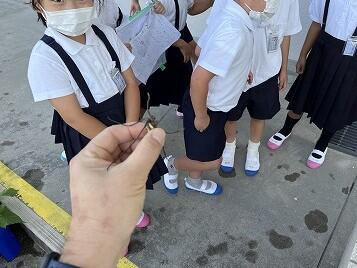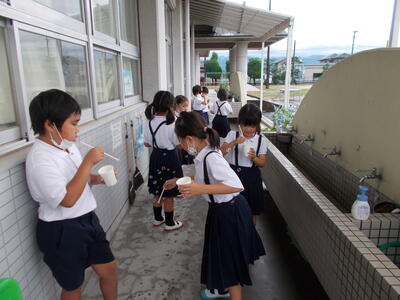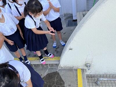 今朝は何やら1年生の教室前のベランダが賑やかでした。