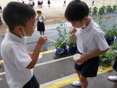 最初はなかなかうまくいかない子どもたちもいましたが、ストローのさきをはさみで切って広げると・・・