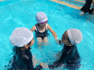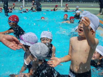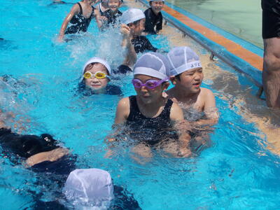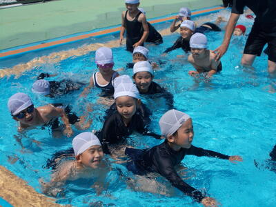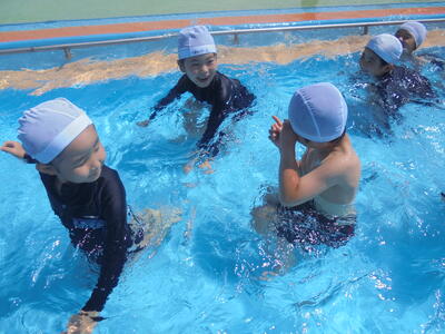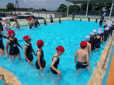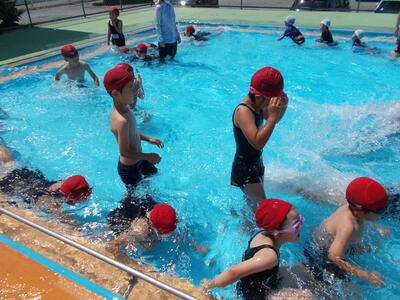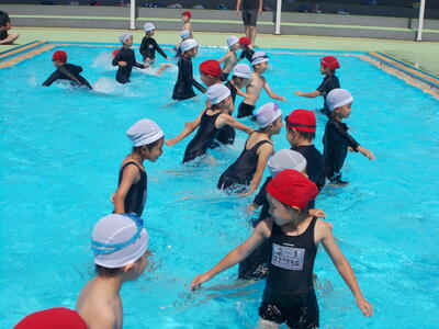 体育館で校長先生のお話を聞いたあとプールへ 向かいました。