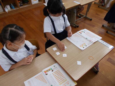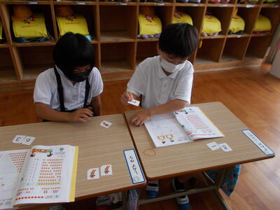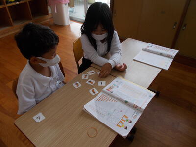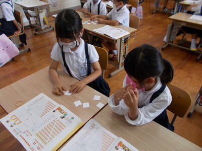 カードをつかって ペアでたし算のれんしゅうを しています。