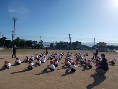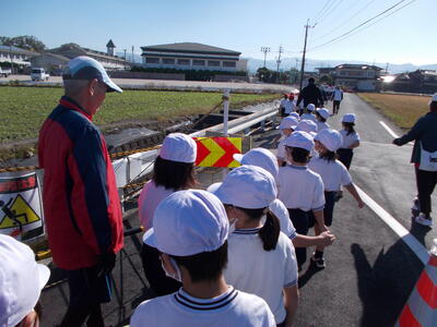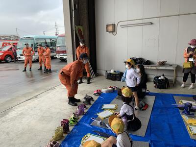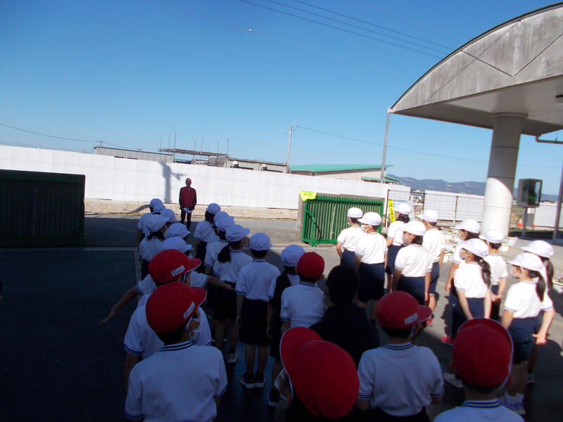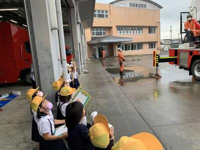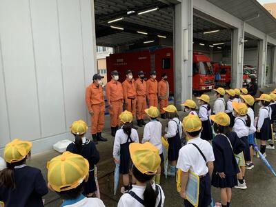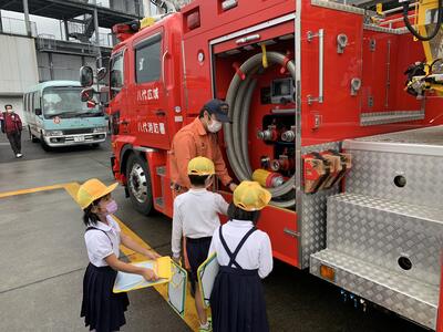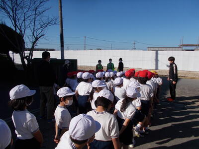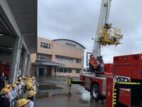 1年生 国語「じどう車くらべ」で学習した はしご車を 実際に見にいきました。 たくさんの 消防士さんたちを前に 緊張気味の1年生苦笑い