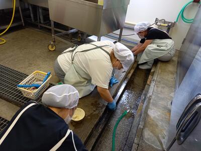 食器を洗う洗浄機です。分解して、隅々まできれいにします。 調理場内の溝掃除。ブラシでこすり、ガンコ汚れを落とします。