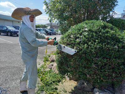 食缶のクラス名も、ペンキで塗り直します。 外周の植木のせんていや、除草作業も行います。