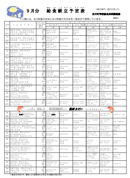 9月の給食献立表を更新します。今月より、様式が変わり、献立表とはいぜん図が別となっています。ご確認ください。