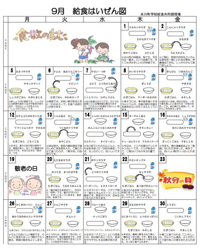 9月の給食(献立表・はいぜん図)
