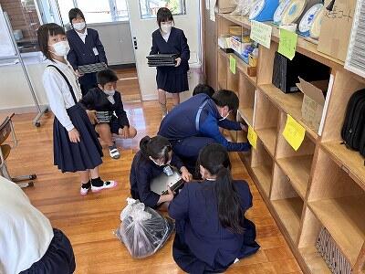 写真を写した時に、返却に来たのは4年生。重たいタブレットをみんなでもってやってきました。担任の先生といっしょに棚にきれいに返してくれました。