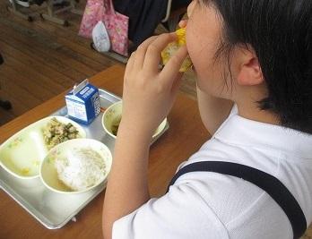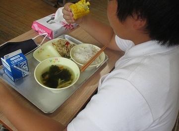 下は、その2年生のことを知ってか知らずか、とにかく給食に出された「とうもろこし」をほおばる6年生。