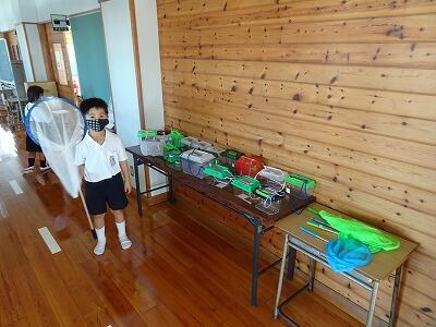 1年生は虫取りに夢中のようです。廊下に置いてある虫かごの前に「虫取り王」が仁王立ちしていたので、つい写真を撮りました。かっこいい~!(実は虫取りに行く前なので、実力のほどはわかりませんでしたが、あとから虫かごを覗いたら、たくさん入っていたので、相当の実力の持ち主に違いありません。)以上。