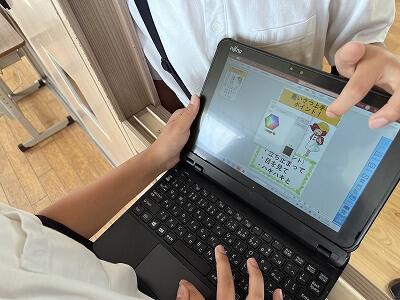写真は、プレゼンソフトを使ってポスター作りをなんと!廊下でやってしまうという、6年生の様子です。まあ、でも最初はちゃんと休み時間に机に座ってか、家に帰ってきちんと作ってくれましたよ(^^;)。Teamsで「先生出来上がりました!」と投稿してきたので、「配置や大きさをかえたり、フォントや色を変えたりしてもっと目立つようにしたらどう?」とアドバイスした後に、さらに仕上げようと私のところにやって来たところでの写真です。