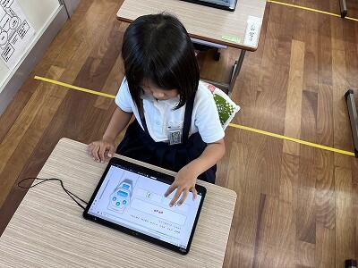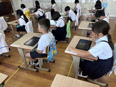 短縮日課で時間を確保の上、教育相談は一人ずつ交代で行いますので、相談を行っている子供たち以外は待ち時間があります。そんな時間を使って今年度はタブレットを使用したデジタルドリルに取り組んでいます。
