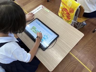 1年生は、勉強にタブレットを使うのはもちろん初めて。まずは自分のパスワードを入れてログインするところから始めて、がんばっています。ペンで字を書いたり、写真を撮ったり、便利な機能を覚えているところです!