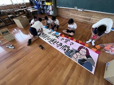 児童会で決めた運動会のスローガンは、6年生の担当で看板を製作していました。本日やっと完成しました。