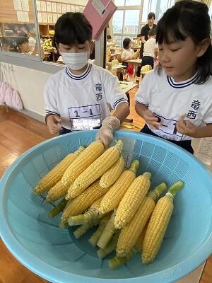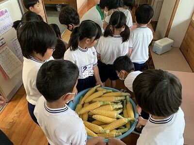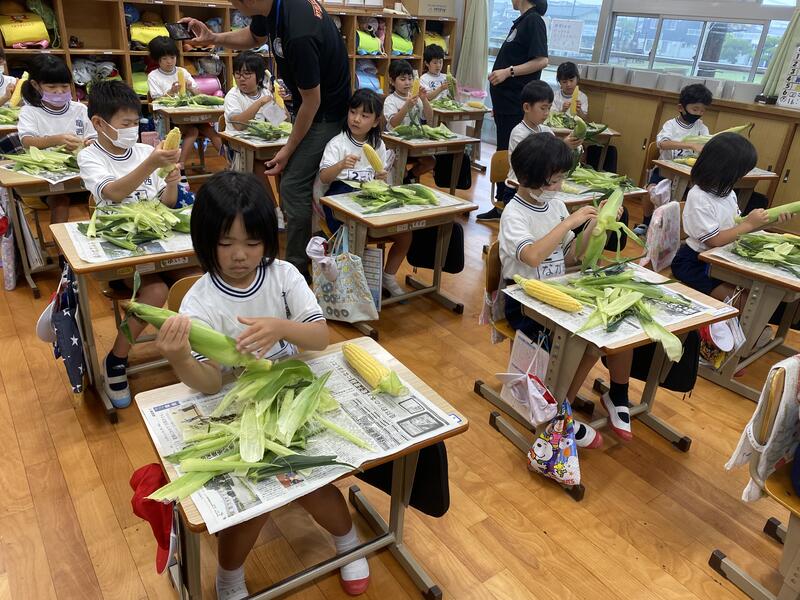 今日は、朝からとうもろこしのかわむき体験をさせてもらいました