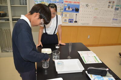 少し前の学習になりますが、「もののとけ方」の学習で、食塩やミョウバンを正確に計り、同じ水の量にど溶けるか溶けるか、また、もっとよく溶けるようにするにはどのようにしたらよいかを実験して確かめました。