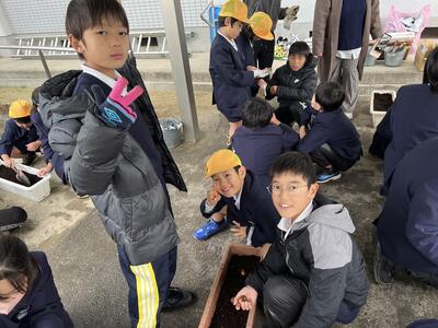19日(火)の5時間目に、1年生がチューリップを植えるためのお手伝いの依頼を受けて、小雨で寒い中プランターの準備からボラ石、土入れをしました。準備が整ってから1年生に来てもらい、植えるお手伝いもしました。各々1年生の様子を見ながら、上手にお手伝いできていましたね。1年生との距離もずいぶん縮まったようです。