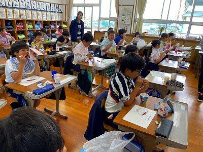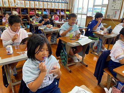 みんな自分で染め出し、歯がきれいなピンク色に!コラー!朝から、ちゃんとみがかんか!