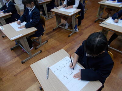 書初め大会に向けて 練習が始まりました。1年生は「ふじ山」と書きます。