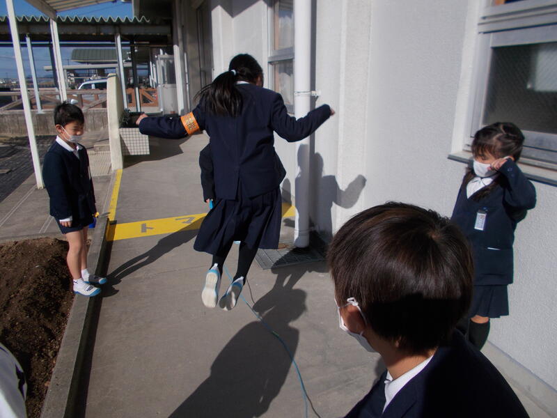 音楽でならった わらべうた「おおなみ こなみ」を 歌いながら みんなで 楽しくとんでいます。