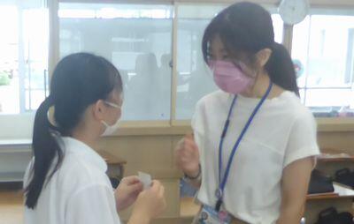 外国語の授業で、友だちを紹介しあう活動を行いました。自分が紹介する友だちをカードに書き、"Who is this?"という質問に、"This is ○○. He is ○○. と答えながら、全員に回っていきました。とても活発に活動ができました。