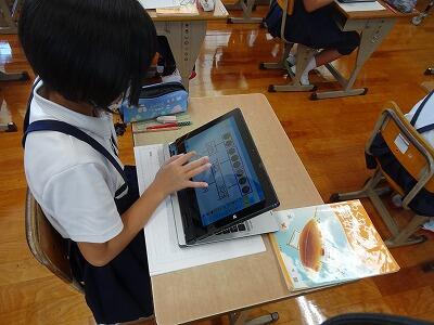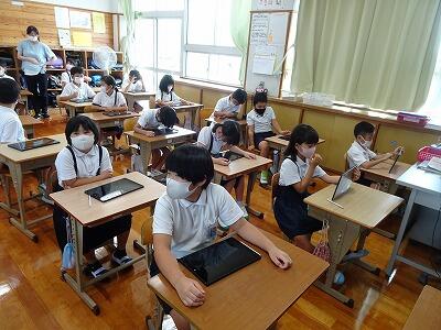 持ち帰りの準備も進めているタブレットですが、学校での使用・活用も一層進んでいけばと思います。4年生の学習では、タブレットで10円玉の絵を動かしたり、線でまとめたりしながら、2けたのわり算の答えを自分なりに出そうとがんばっていました。丸や四角で囲んだり、文字を入力したりしながら、みんなにわかりやすく伝えられるようにがんばっていました。「それぞれ面白いまとめ方ができているな~」と思ったのですが、そこをどう説明していくか、そしてお互いの意見をどうまとめていくかも2学期のがんばりどころのようです。