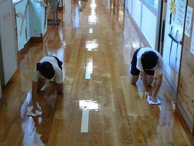 きれいになった廊下の床。ぞうきんを絞ってていねいにていねいに拭いてくれています。