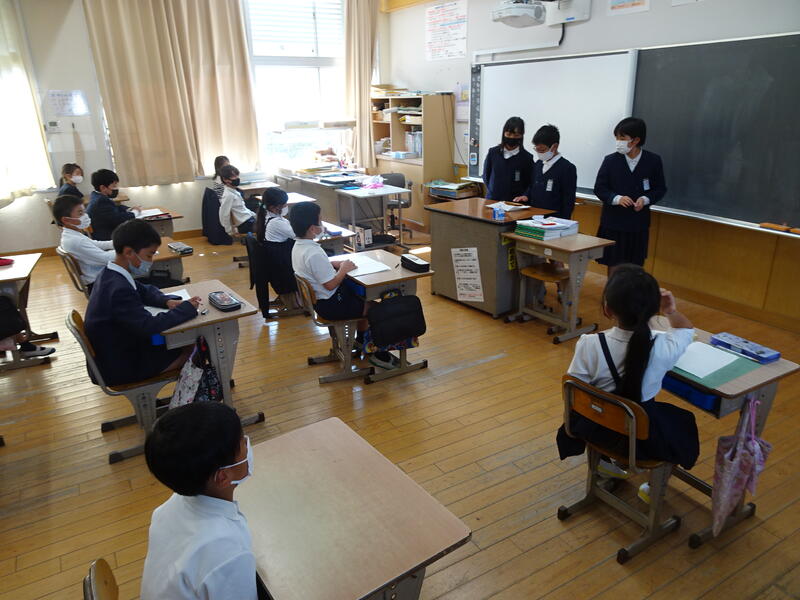 中学生が準備してくれたスライドを見ながら、町の特産品や歴史について学習をしました。中学生とやり取りしたり、クイズに答えたりしながら、どの学年も楽しく学習できました。質問もたくさんしてしっかり学ぶことができました。中学生は本番緊張気味の様子も見えましたが、1時間しっかり頑張ってくれました。ありがとうございました。