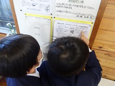 もう一枚は、保健室の掲示板にある「パズル」を楽しそうにやっている2年生です。掲示板はお知らせが載っているだけでなく、子どもたちが楽しみながら「学ぶ」場所でもあります。