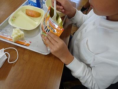 給食室の「今日の献立」でも紹介してありますが、今日の給食には非常食である「救給カレー」が出ました。今日の献立を見ていた1年生は「ん?きゅうけつカレー?」と、なんだろな~顔をして友達と話をしていました。4年生は、授業にやってきては「今日は救給カレーだ!!たのしみ~!」と叫んでいました。