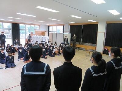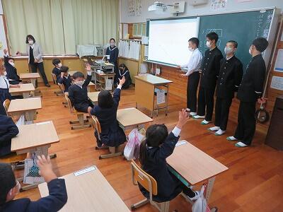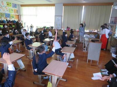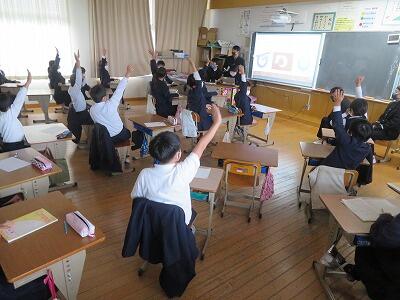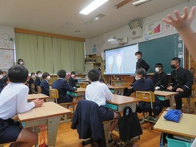 中学生が準備してくれたスライドを見ながら、町の特産品や歴史について学習をしました。中学生とやり取りしたり、クイズに答えたりしながら、どの学年も楽しく学習できました。質問もたくさんしてしっかり学ぶことができました。中学生は本番緊張気味の様子も見えましたが、1時間しっかり頑張ってくれました。ありがとうございました。