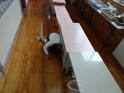 給食の準備中に一生懸命給食台の下を拭く1年生 |