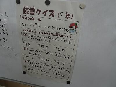 今週から読書旬間ですが、図書委員さんが「読書クイズ」を作ってくれたようです。5年生の教室前で掲示してあるのを見つけました。学年に合わせて問題が出されているようですね。みんな本を読んでしっかり答えましょう。