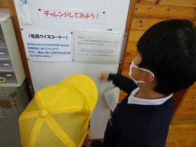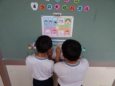 もう一枚は、保健室の掲示板にある「パズル」を楽しそうにやっている2年生です。掲示板はお知らせが載っているだけでなく、子どもたちが楽しみながら「学ぶ」場所でもあります。