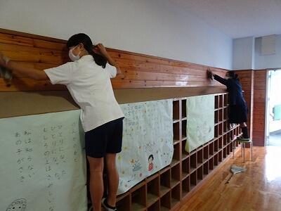 ・・・・いえいえ、雨が降っていたので、室内の掃除をがんばっている6年生の様子です。室内のくつばこ(今は靴箱としては使っていませんが)の上のホコリがたまっているところを、せっせとふきそうじしてくれています。「写真を撮るよ~」といったら「えへへ~」「きゃー」と楽しそうに叫んでいました。ボランティアも楽しむ6年生です。