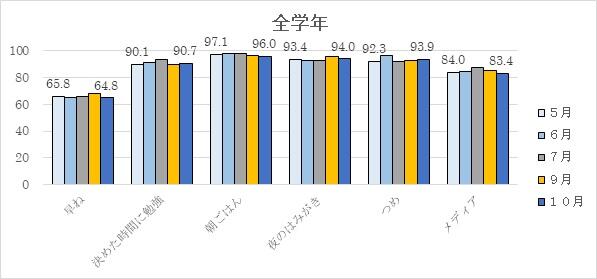 西部小の子供たちの課題は、明らかに「早寝ができていないこと」です。5人に2人ぐらいは「遅くまで起きている」傾向がありそうです。ここには載せませんが、学年によっては半数以上が「早寝ができていない」学年もありました。「メディア」の結果が低いのと合わせ、今後夜の過ごし方をしっかり考えていかねばならないようです。お子さんの夜の様子はどうでしょうか。