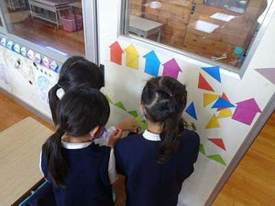 昨日の話題で持久走の練習のことを載せましたが、今朝は朝から運動場を走っている子供たちがいました。たぶん2年生のようでした。すすんで走ってがんばるな~と思いました。休み時間の1年生教室に行くとマグネットのいろいろな形の図形を並べて遊んでいました。とっても楽しそうにやっていたので、カメラをあわてて取りに行って撮りました。カメラを向いてニコニコの写真もあるのですけど、そちらはホームページには×なので、下の写真で様子を感じてください(^^♪。