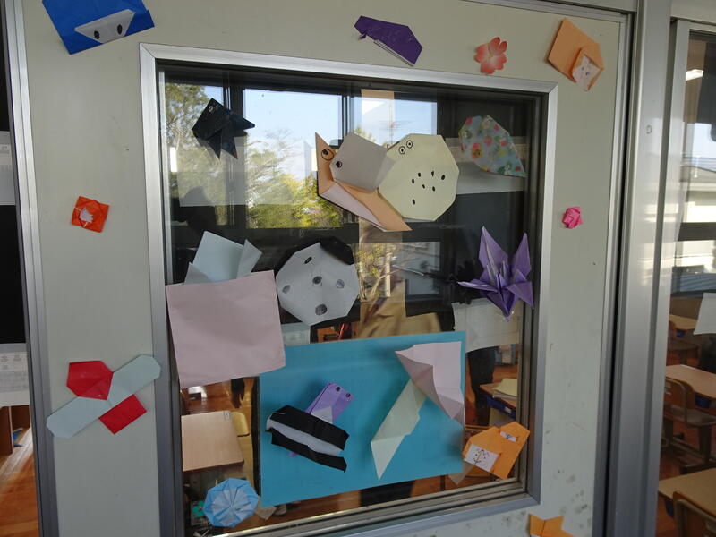 写真は2年生の教室の入り口にかざられた折り紙の数々(#^^#)