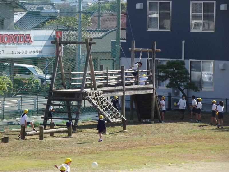 写真は昼休みに運動場の隅の遊具で遊ぶ子供たち。さて何年生でしょう(結構上の学年のようですね)。