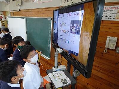 2年生の教室を通りかかると、何やら2年生は一生懸命クイズらしきものをそれぞれ作っていました。それを大型テレビに映して、発表の練習?「あ~みないで~」なんて声も聞こえていました。