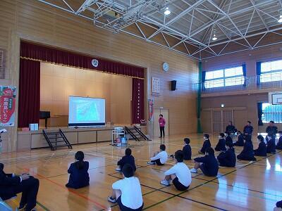 PR動画を見せていただいた後、イチゴのクイズなどもありました。そのあとイチゴの贈呈式。たくさんのイチゴをいただいて、今日の給食は早速イチゴが出されました。とっても甘くて美味しかったです。本当にありがとうございました。