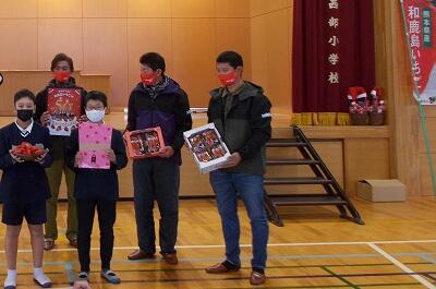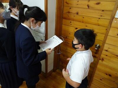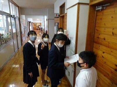 もう一枚は、図書クイズの正解者に、賞品(1冊本が多く借りられる"しおり"らしい・・・)?をあげているところ。5・6年生は、委員会も日々がんばっています。