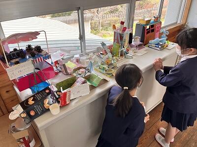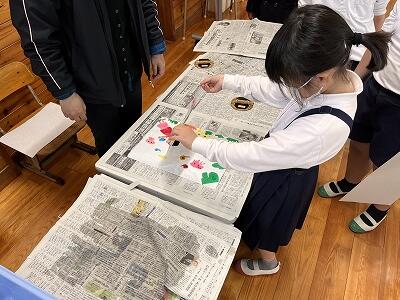 写真は、友だちの作品を楽しそうに見ている2年生と紙版画づくりをしている1年生。最後の学年もまとめもみんながんばってます。