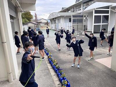 今日の写真は6年生で行きます!寒い朝も「朝ボラ」がんばっていますが、寒い中きれいに花が咲きだした花壇の周辺の草取りがんばっています。そして業間は「なわとび」をみんなで楽しんでいました~。