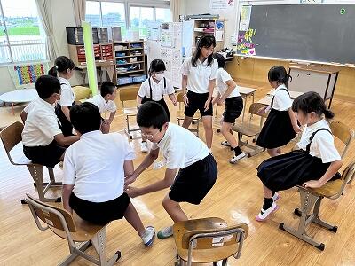左はテストに頑張る5年生~。右はたてわり班で楽しかった「じげんばくだんゲーム」をみんなで楽しむ1年生。それぞれの学級の1学期が終わろうとしています~~~~~。