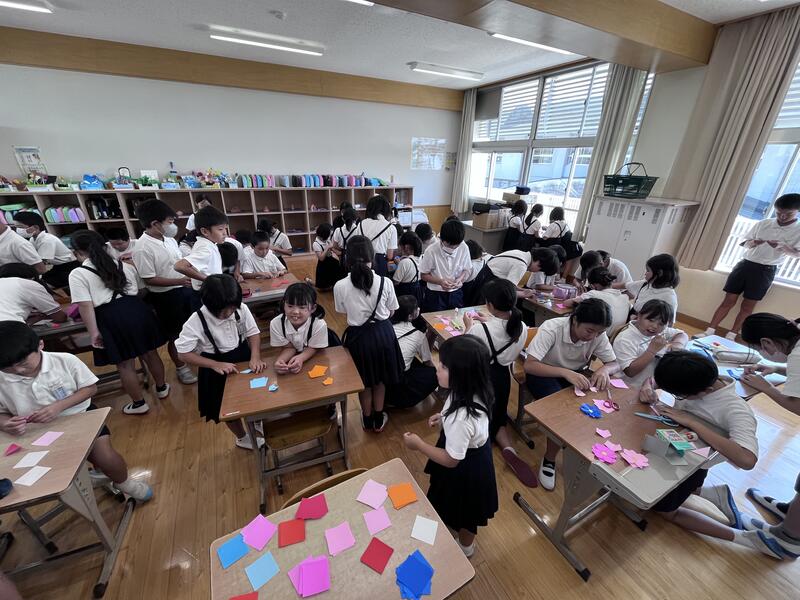 実は児童会の取組で、来週から「苦手をなくそうチャレンジ」というのを行うのですが、その目標を達成したときに掲示板に貼る「コスモス」の花づくりを行ったのでした。1学期はひまわりを作りましたが、その時よりさらに大勢が集まってくれて、花づくりをすることができました。
