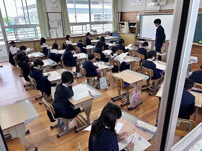 今日は2~6年生で学力検査を行いました。「あ~、どうしよ~」「できるかな~」と不安な声を漏らしつつもみんな2時間真剣に受けていました(左の写真は3年生)。