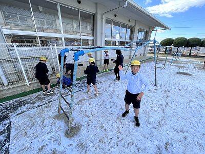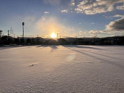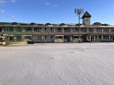 八代市内はそうでもなかったですが、氷川町は雪で真っ白です。校内もあちこち凍っています。道路も凍(こお)っているかもしれません。児童の皆さんは気を付けて登校しましょう。